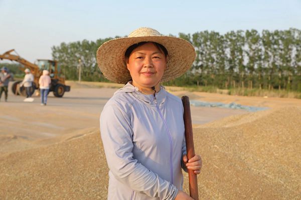 潘智慧是社區(qū)工作者,丈夫朱文彤作為農(nóng)場公司辦公室主任,是支農(nóng)志愿服務(wù)隊第一小隊負(fù)責(zé)人,掛鉤地處農(nóng)場最北端的農(nóng)牧中心,負(fù)責(zé)掛鉤單位搶收及場面相關(guān)指揮協(xié)調(diào)工作。在知曉丈夫“出征”后,今年50歲的她也不甘落后,第一時間主動請纓前往地處農(nóng)場最南端、小麥種植面積高達1.8萬余畝的西陬生產(chǎn)區(qū)。她早出晚歸,每天穿梭在各個曬場,和大家一起翻場、堆場、協(xié)助運糧。炎熱的天氣曬得她臉部脫皮,手上腳上磨出了老繭,腰疼的老毛病也隨之加重,但她咬牙堅持,從不抱怨,她和丈夫成為“三夏”前沿南北守望、遙相呼應(yīng)的最佳“夫妻檔”。