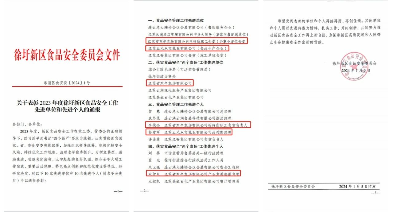日前,徐圩新區食品安全委員會開展徐圩新區食品安全工作先進單位和先進個人評選活動,經研究決定授予10家先進單位和10名先進個人稱號。東辛農場有限公司榮獲徐圩新區落實食品安全“兩個責任”工作先進單位榮譽稱號,江蘇三元雙寶乳業有限公司、東辛農場有限公司招待所職工食堂榮獲食品安全管理工作先進單位榮譽稱號,郭愛軍、李榮全榮獲食品安全管理工作先進個人榮譽稱號,宋智星榮獲落實食品安全“兩個責任”工作先進個人榮譽稱號。