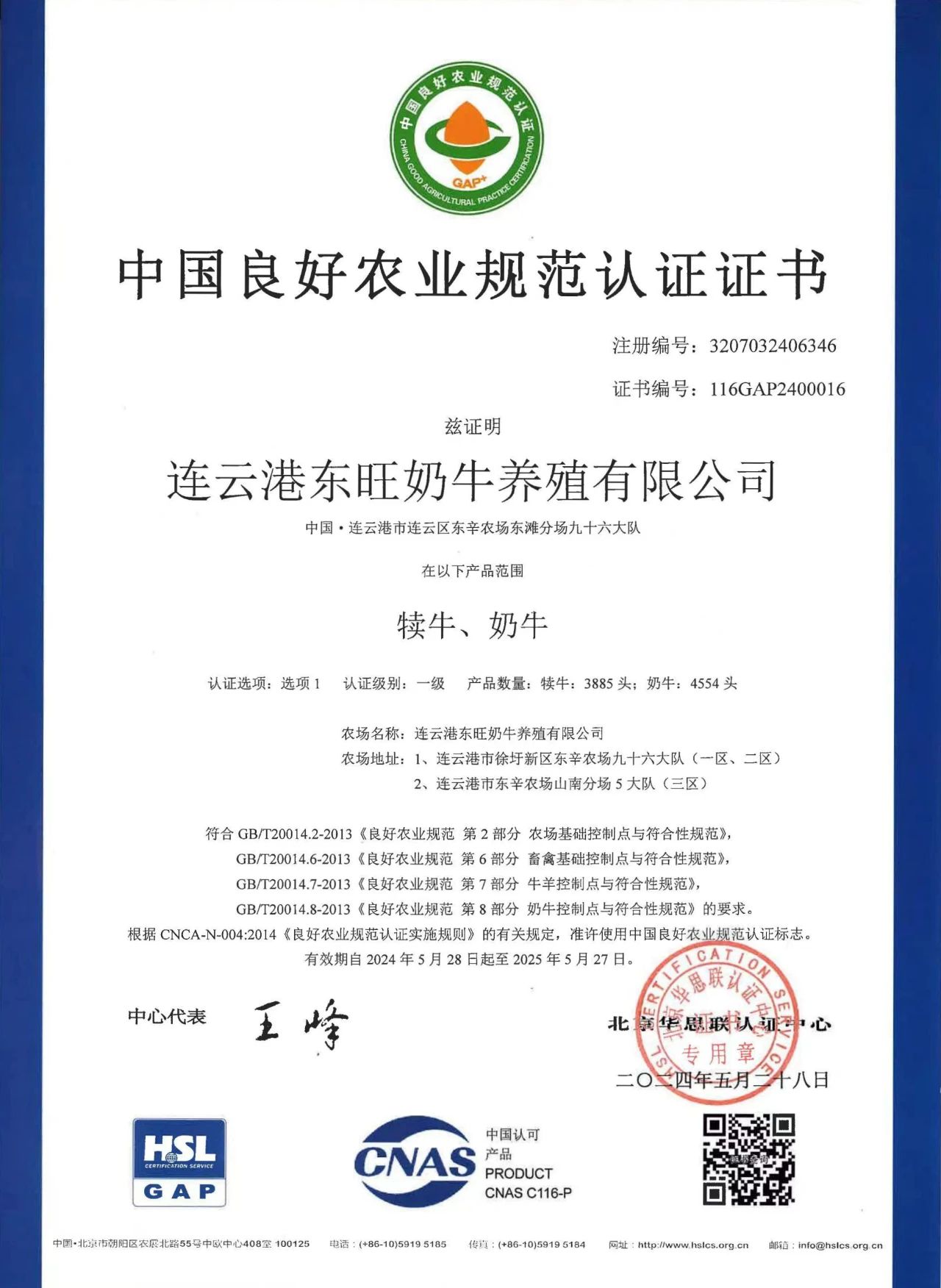 5月28日,東旺奶牛公司通過北京華思聯認證中心審核,獲評中國良好農業規范一級認證(GAP+)。