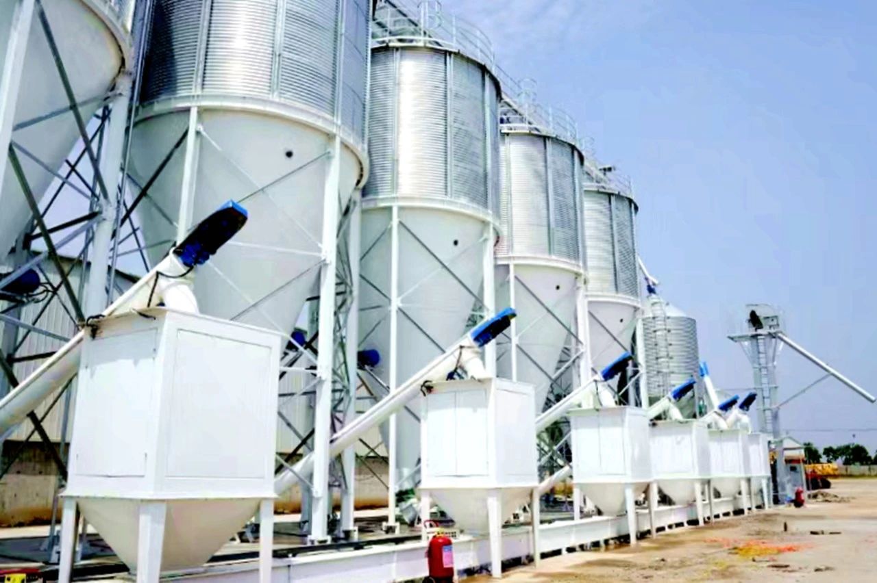 “牧場建有大精料罐5個,小精料罐3個,所有精飼料都將通過精準系統監控運行,不同精料罐中的精料經提升機到達暫存倉,然后通過管道傳輸至牽引式TMR車中,與其它飼料原料混合攪拌均勻后投放到牛舍各個區域。”飼料加工車間負責人陳毅介紹說。
