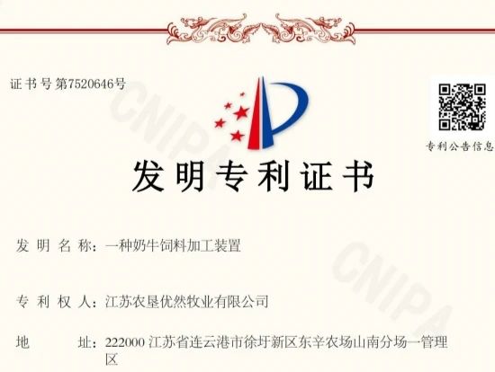 近日,蘇墾優(yōu)然牧業(yè)公司自主科研創(chuàng)新成果“一種奶牛飼料加工裝置”成功獲得國家知識(shí)產(chǎn)權(quán)局發(fā)明專利正式授權(quán),這也是蘇墾優(yōu)然牧業(yè)公司成立以來獲得的首個(gè)發(fā)明專利證書。該專利的取得,進(jìn)一步提升了公司的核心競(jìng)爭(zhēng)力,對(duì)加快打造華東地區(qū)現(xiàn)代化智慧牧場(chǎng)起到了積極推動(dòng)作用。